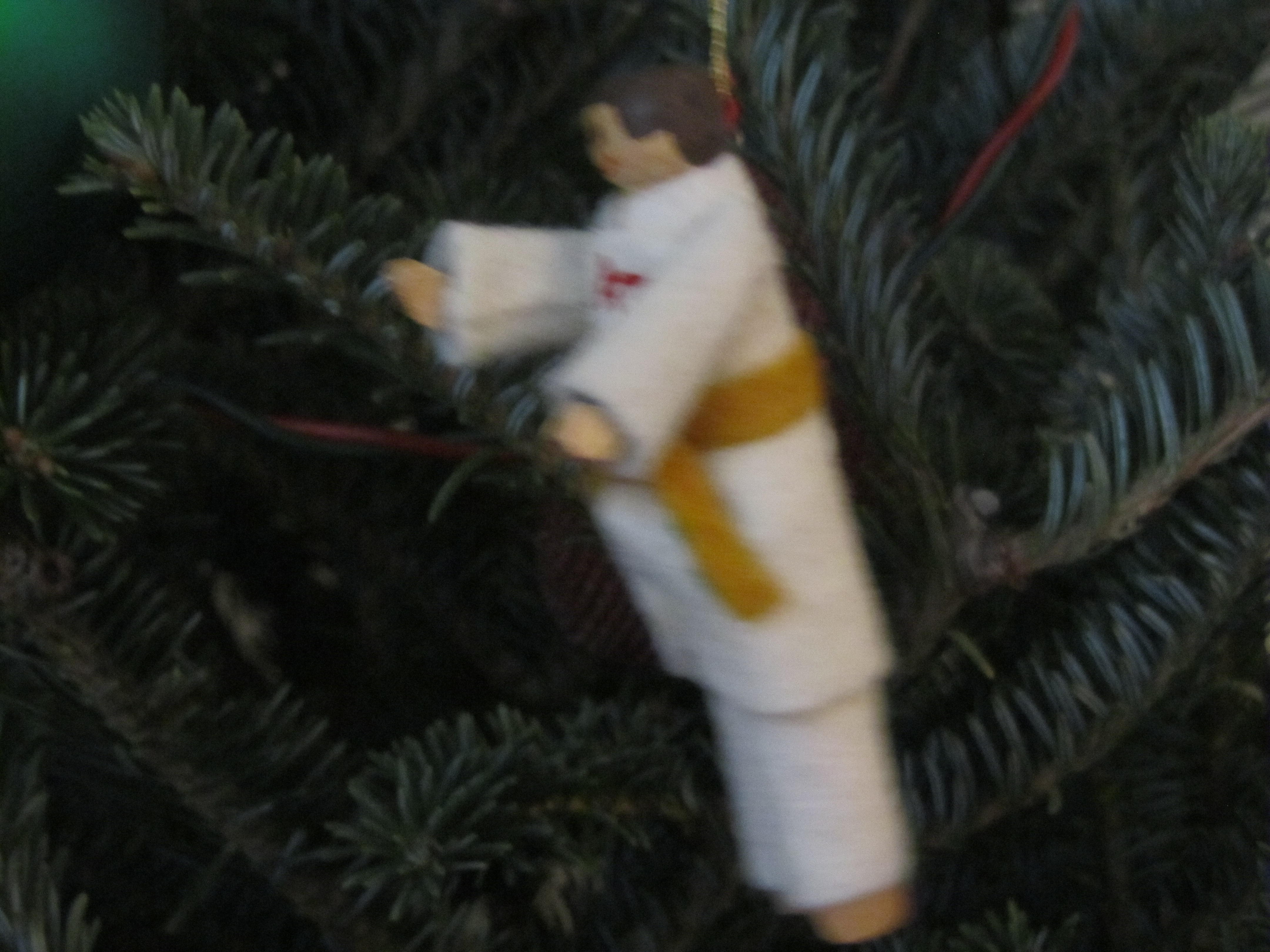 Another year, Mom decided she wanted to spice up the Christmas tree. So, She took a bunch of clothes pins and constructed a few figurines of her own. One was me in my Tae Kwan Do get-up.