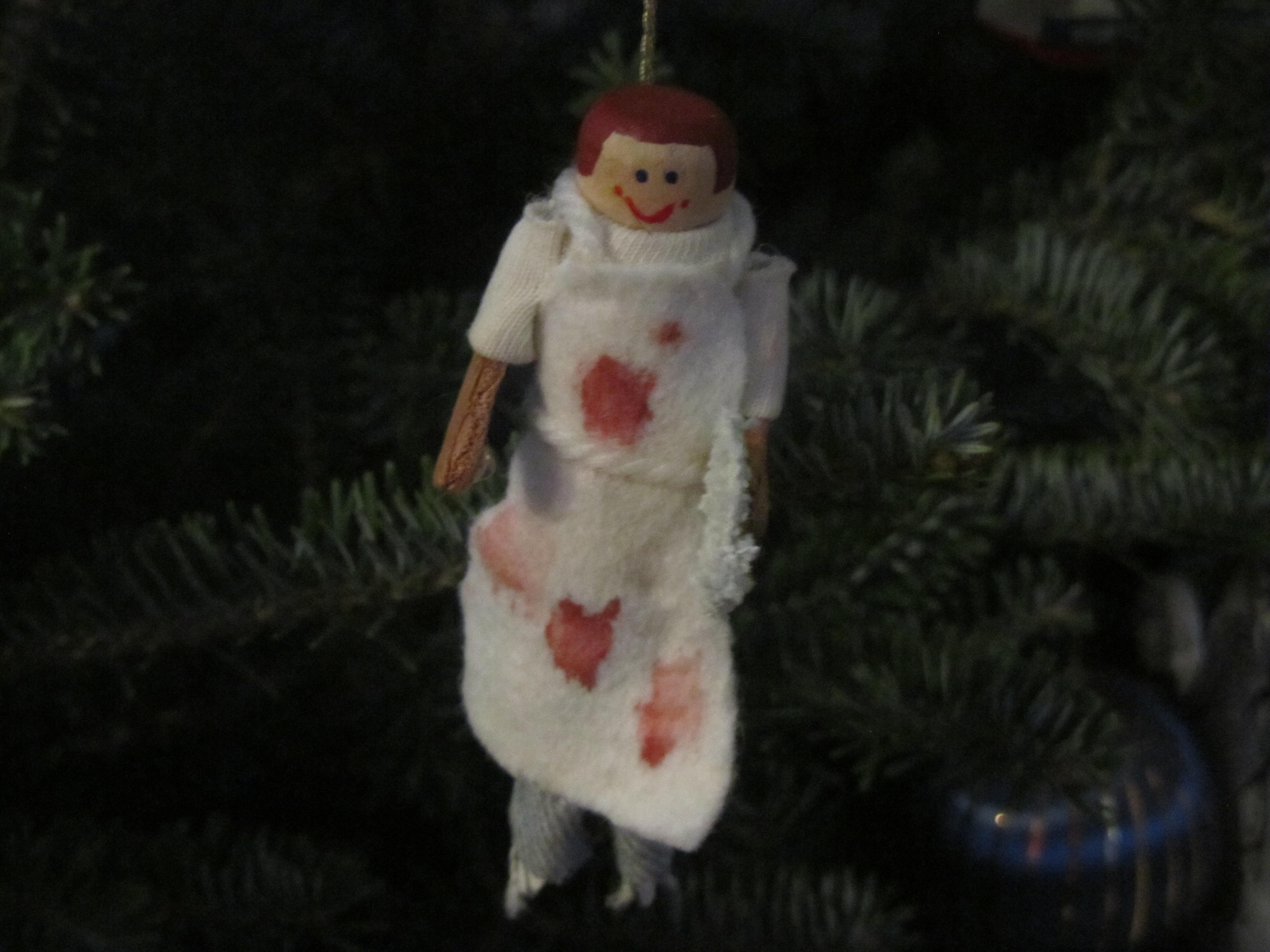 I know, everybody thought the same thing. Mom didn’t know she was creating a Dave-as-serial-killer figurine and the thing was even freakier when Dave carried a big fucking meat cleaver, but that thankfully fell off. That freaky little thing hangs on our Christmas tree every year as a not-so-settle reminder of what Dave does when he doesn’t like his presents. I still see the spooky little smile on its face in my nightmares.