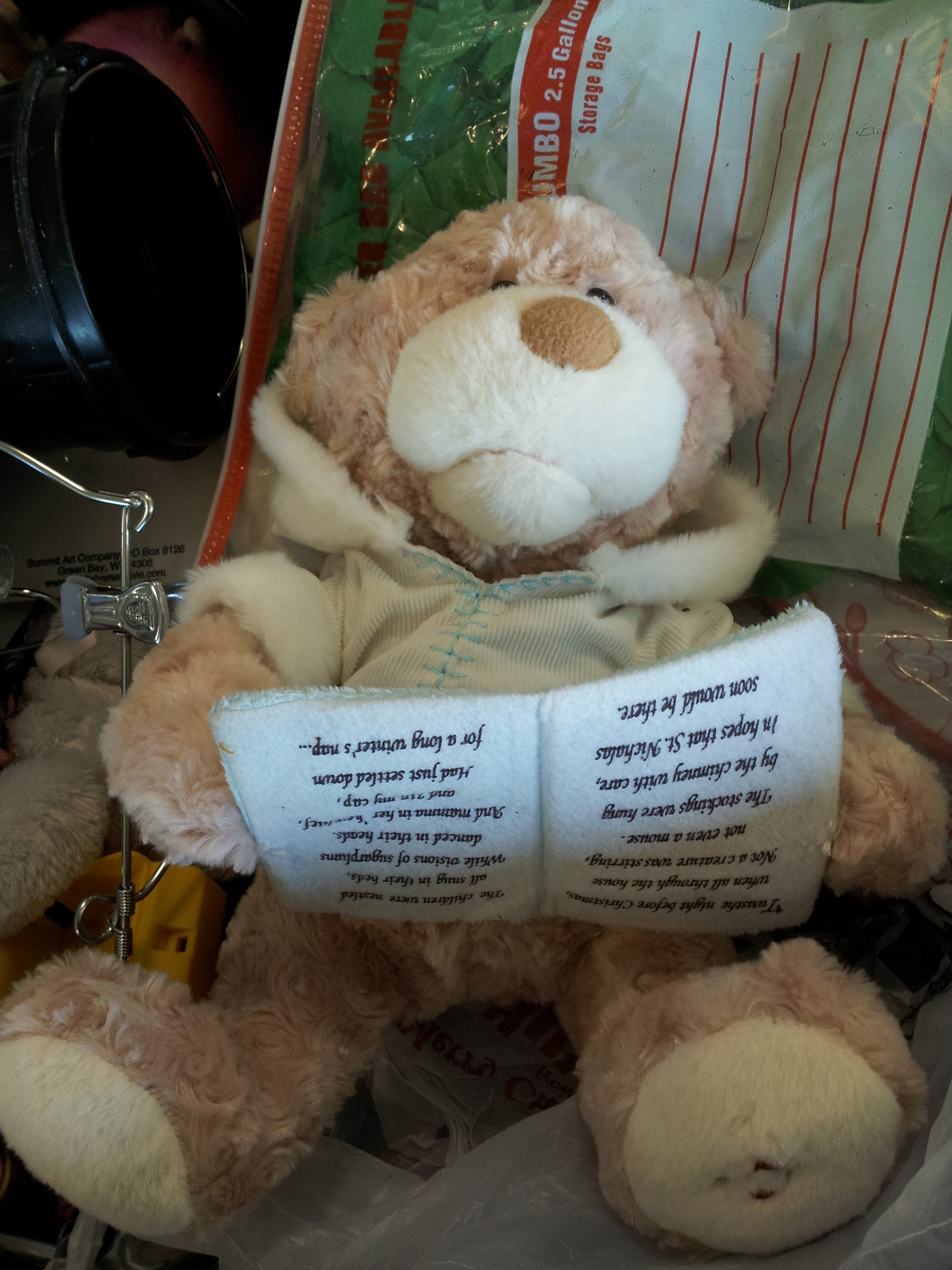 A-freakin-dorable, right? There was a multitude of this very type of bear in the bins and I would have been gleeful to give one of them to either my niece or nephew were they not past the age of appreciating them. They’re older now and I’m pretty sure Jake is coming up on the age where he gets his learner’s permit and Izzy is probably reading Seventeen or Kiddy Cosmo or whatever is appropriate for her age right now.