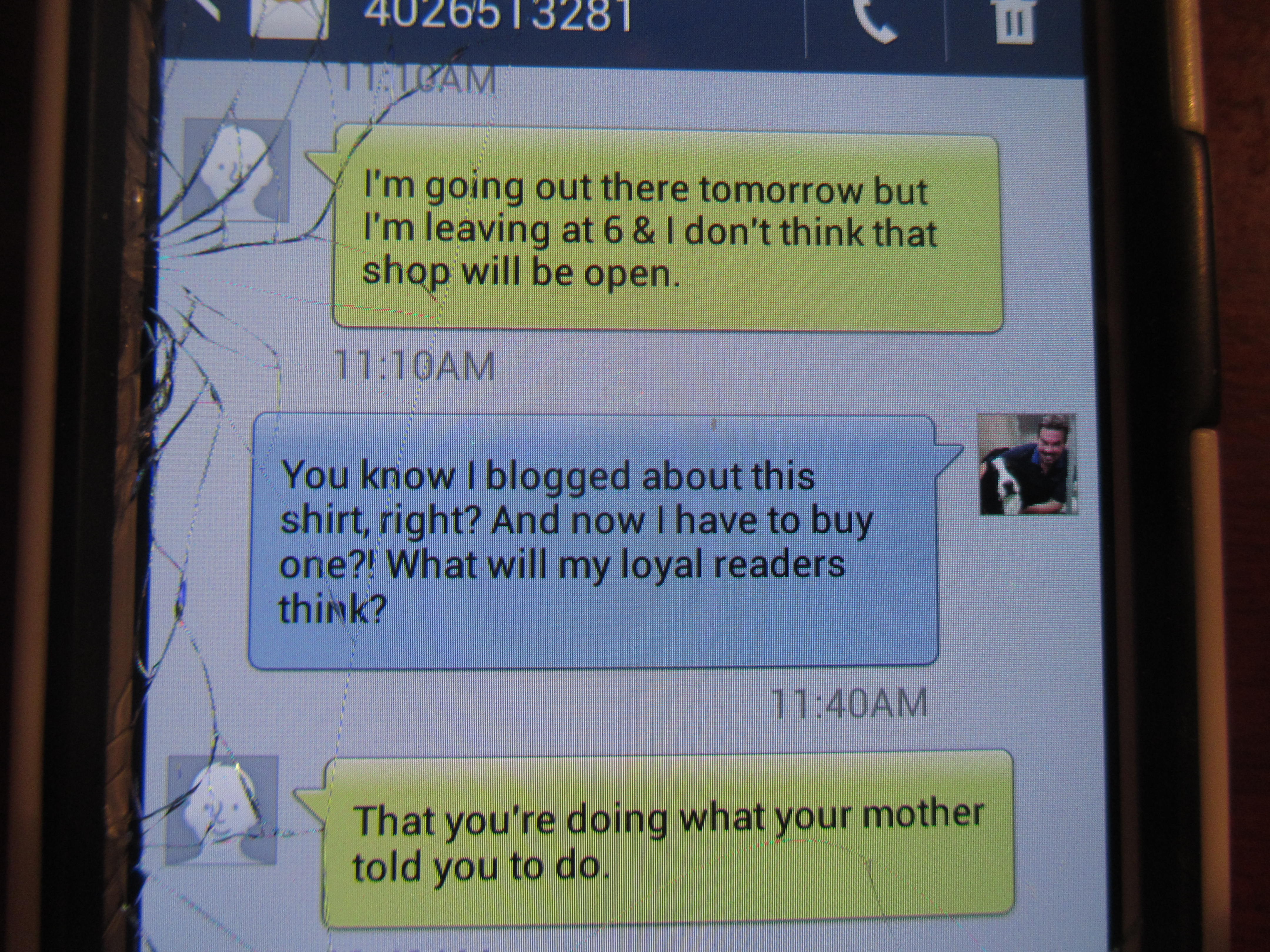 Unaware at this point if she had read either the post about the shirt or the Fun with Texts Part. 1, I warned her of the possible ramifications (I also ignored the glaring error in light of my giddiness).